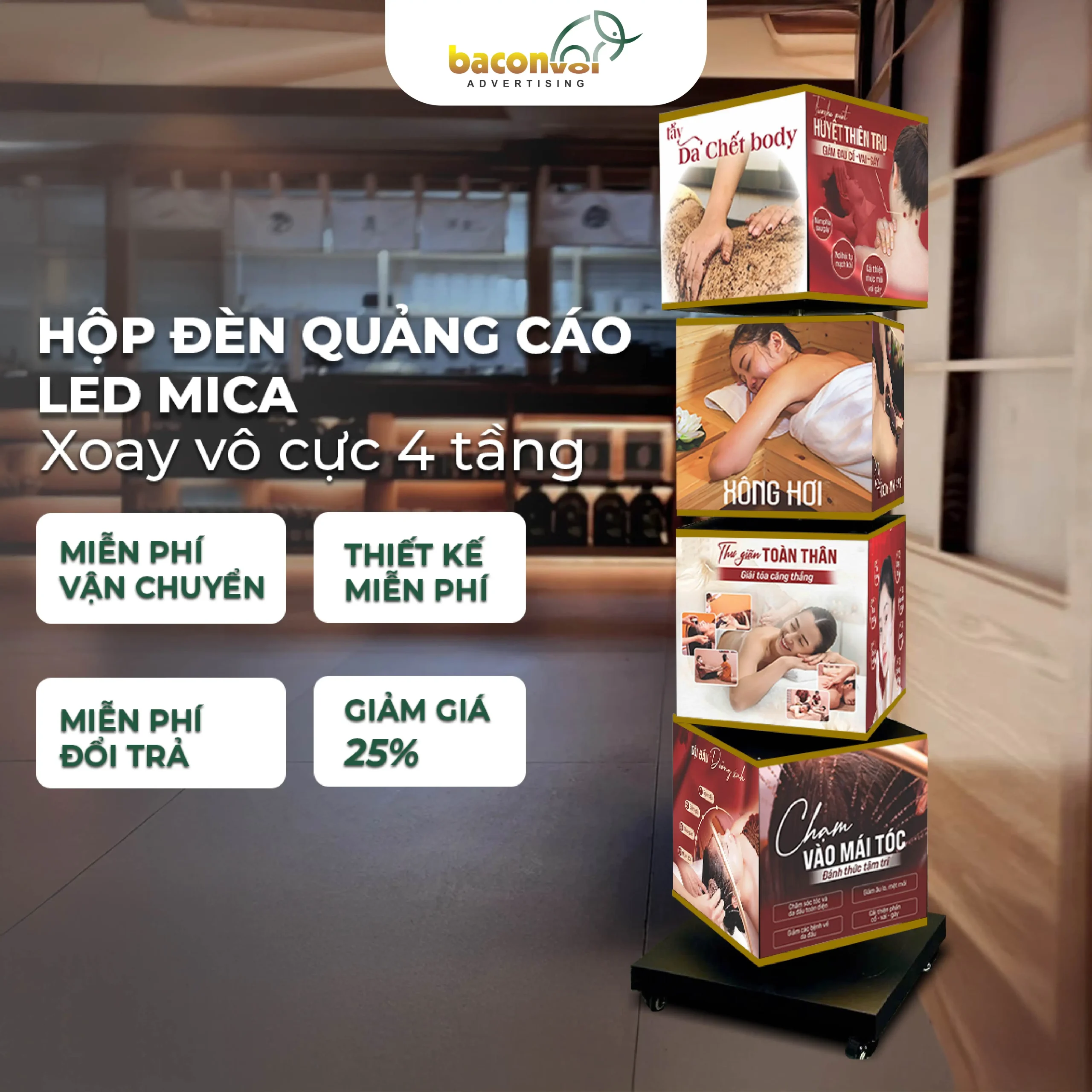Biển quảng cáo Ba Con Voi sở hữu tính năng vượt trội với cơ chế xoay linh hoạt và khả năng tùy chỉnh cao, giúp đáp ứng nhu cầu quảng bá của mọi doanh nghiệp, từ nhỏ đến lớn. Sản phẩm kết hợp thiết kế thông minh và công nghệ hiện đại, với khả năng xoay mượt mà, ánh sáng LED nổi bật và dễ dàng điều chỉnh nội dung theo chiến dịch marketing.