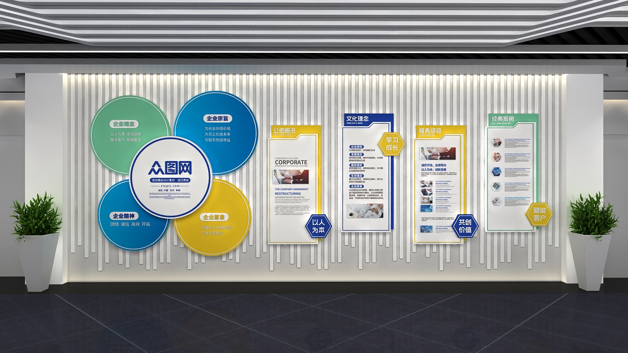 Tường văn hóa doanh nghiệp 3D được thiết kế theo phong cách hiện đại, kết hợp bố cục hình tròn trung tâm và hệ thống khung nội dung nổi bật hai bên, tạo điểm nhấn sang trọng cho sảnh lễ tân, văn phòng công ty, showroom, trung tâm đào tạo.