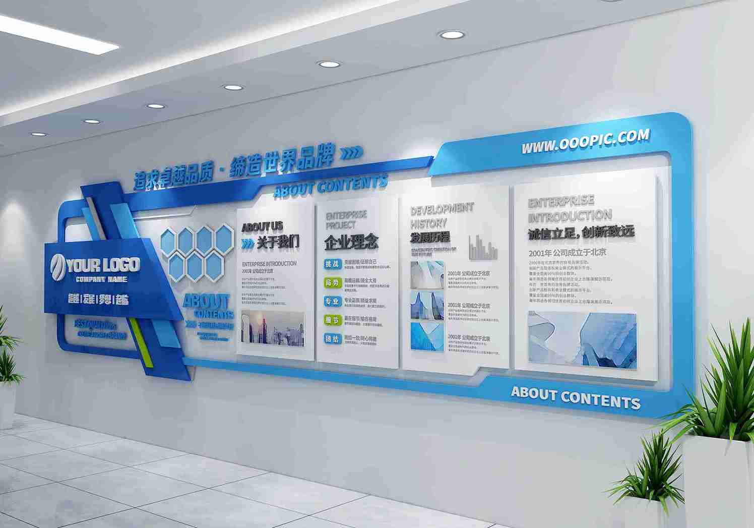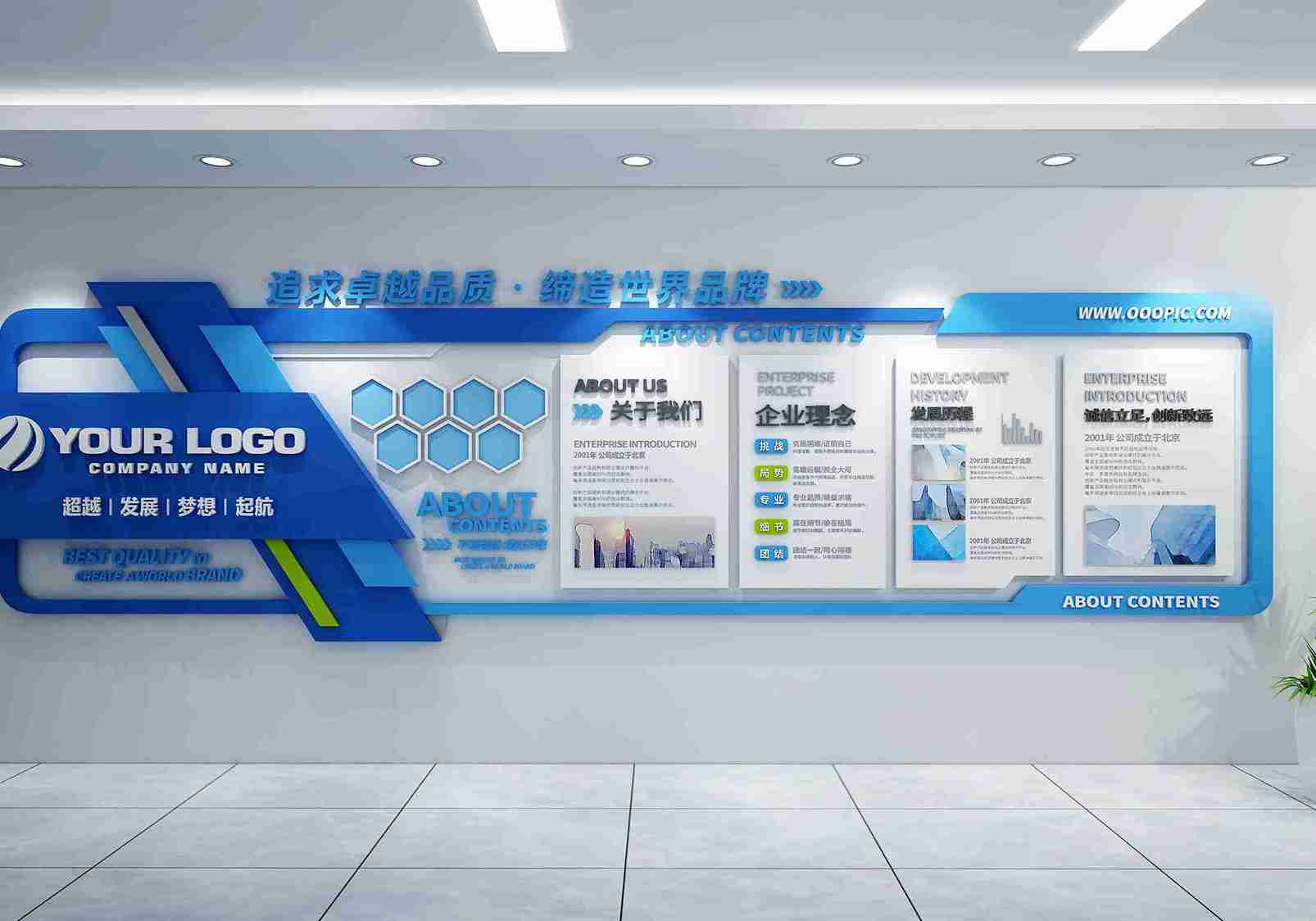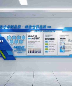 Tường văn hóa sử dụng phong cách hiện đại với gam màu xanh chủ đạo, kết hợp logo, biểu đồ, infographic và khối nội dung rõ ràng, tạo cảm giác chuyên nghiệp – công nghệ – uy tín. Không chỉ nâng cao thẩm mỹ cho không gian văn phòng, tường văn hóa còn đóng vai trò là công cụ truyền thông hiệu quả, giúp nhân sự ghi nhớ giá trị cốt lõi và tạo ấn tượng mạnh với khách hàng, đối tác.